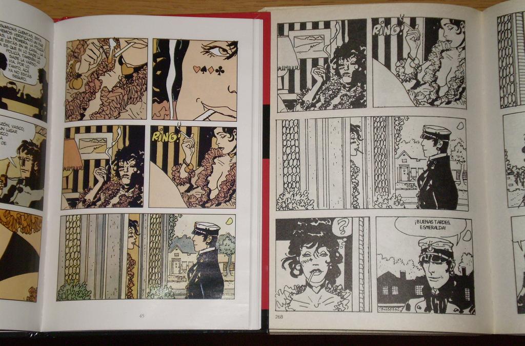 a mí, la verdad, me gusta la solución encontrada por la edición color. (que, según estuve viendo en internet, es en verdad una colección francesa que está reeditando todo corto maltés, el total de títulos es como el doble que el de la de clarín. se me hace agua la boca al verlo.) es medio bruto lo que hicieron en la muerte de escudero, de todos modos… quizás podrían haber recortado otro cuadro como el de la calle (cuánto les estoy perdonando ya) y conseguir que quede en página diferente al baile. pero si viene un francés y me dice que intentó lo mejor posible, le voy a creer.