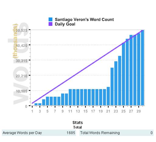 …Que por ahora es un borrador en mi disco duro. Escribí con la ayuda del Mes de escritura de novela (NaNoWriMo), un evento virtual anual donde uno se desafía a escribir 50.000 palabras en un mes (unas cien carillas A4), y es medido en su progreso.